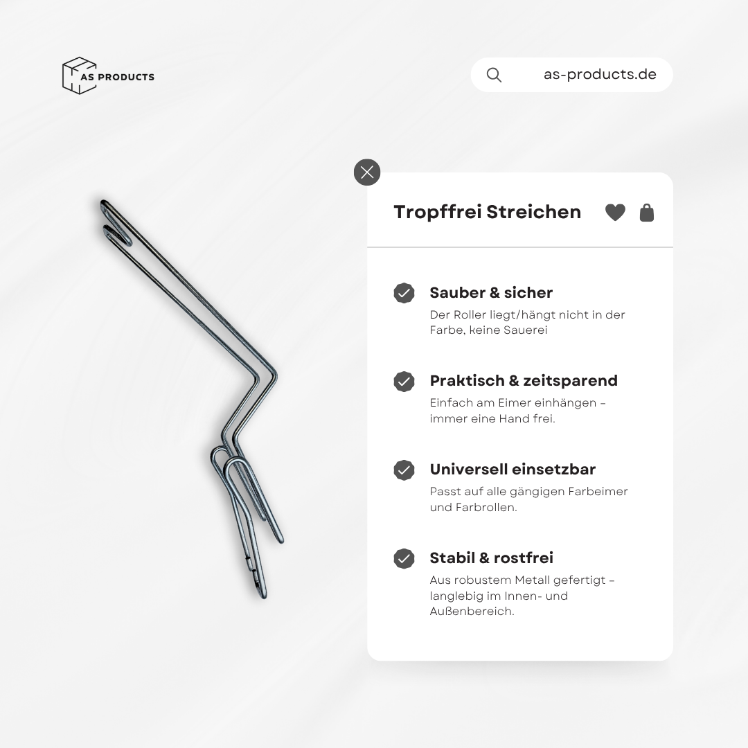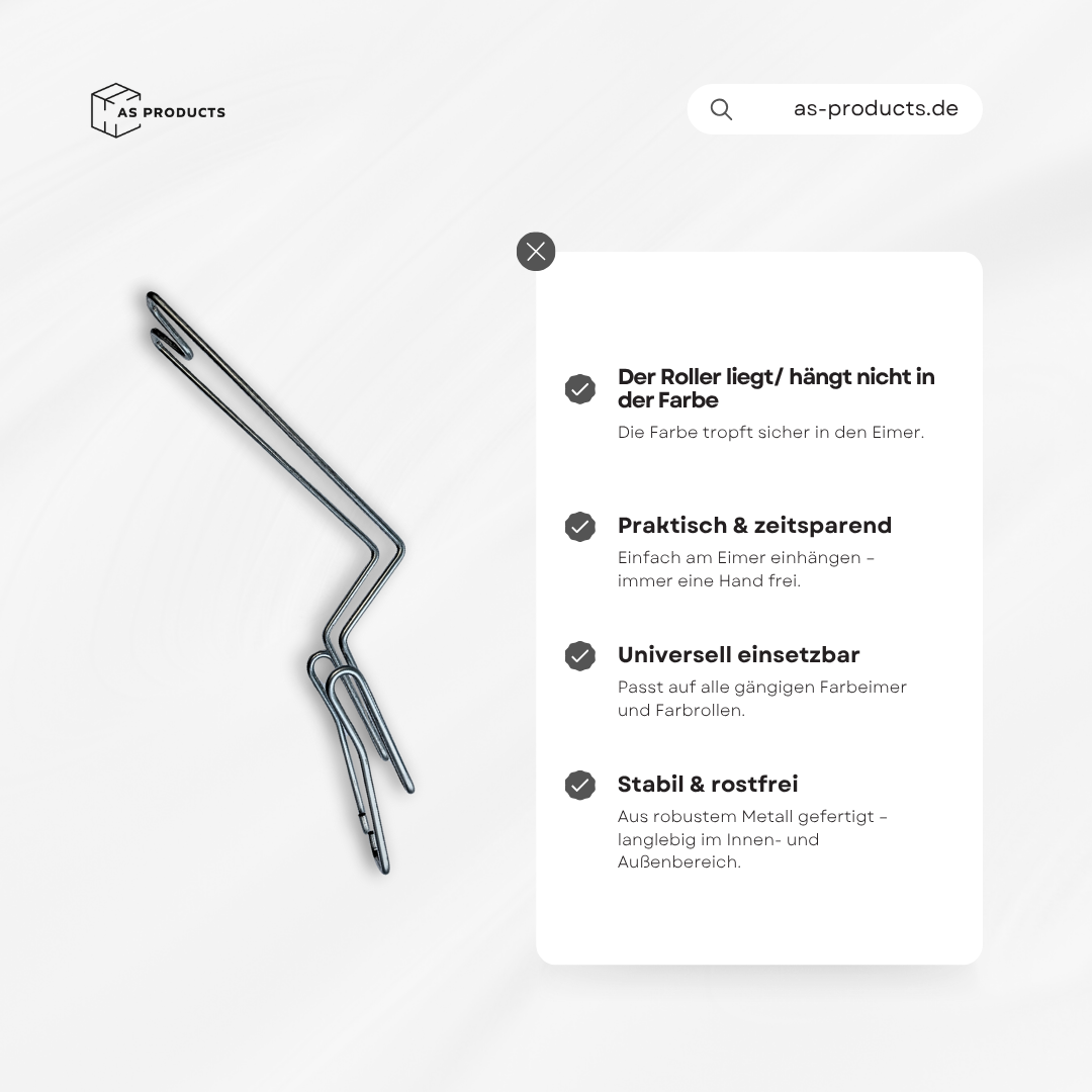 Kein Balancieren am Eimerrand, kein unsauberes Ablegen der Rolle und eine Hand frei für mehr Sicherheit auf der Leiter. Passend für handelsübliche Farbeimer und -Rollen. Ideal für Profis und Heimwerker - ein kleines Detail mit großer Wirkung.